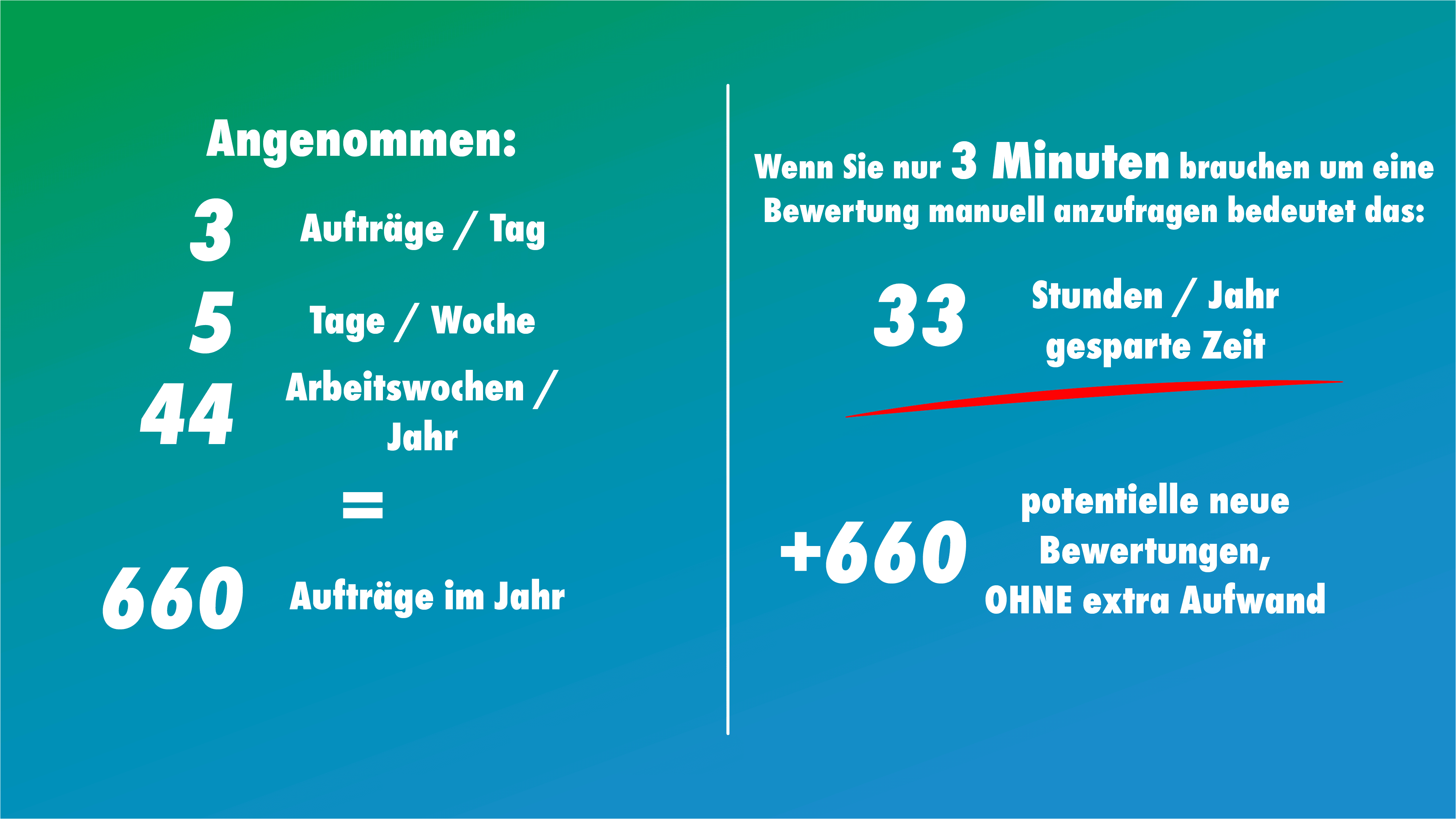 Wenn alles gut war, denken die meisten Menschen nicht von alleine daran eine Bewertung abzugeben, obwohl sie dazu bereit wären, wenn man sie fragt. Aber haben Sie die Zeit, jeden Kunden zu bitten eine Rezension zu schreiben? Auch wenn es nicht lange dauert, auf das Jahr gesehen addiert sich die Zeit. Oft wird es dann einfach nicht gemacht, weil andere Dinge wichtiger sind.